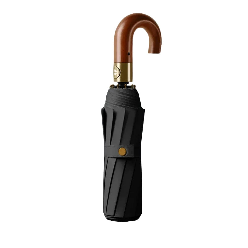Ce parapluie est équipé d’un manche en bois courbé, conçu pour offrir une prise en main stable. Cet élément fait partie du design du produit et constitue un détail de finition, adapté à un usage quotidien par temps de pluie.